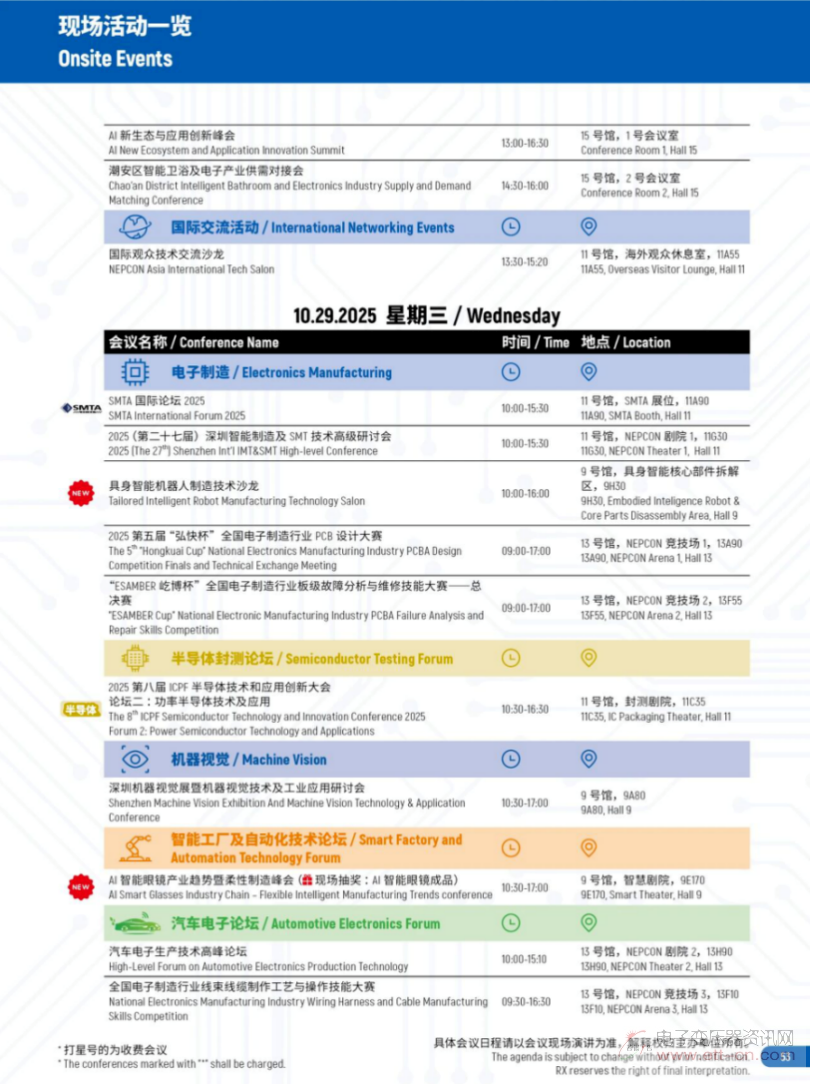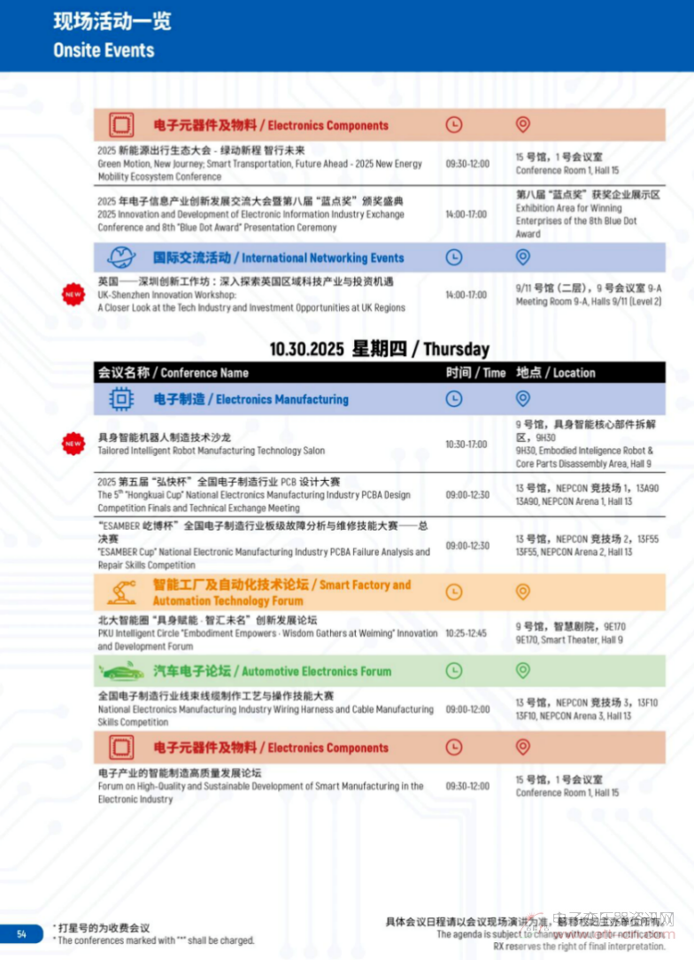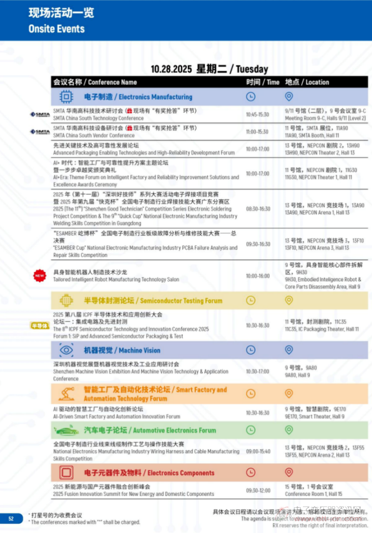 本届展会不仅打造具身智能机器人及核心零部件拆解区、AI智能眼镜拆解区、IGBT & SiC模块封测工艺示范线、电子成品自动化包装示范区、柔性生产制造及智能输送主题展区等亮点展区,还有40场会议活动覆盖七大模块,助力广大观众一站式看尽电子制造黑科技!