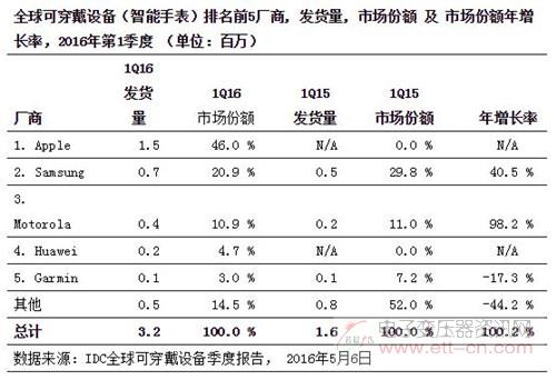 2016年全球可穿戴设备市场的趋势是:大量新产品发布,产品价格普遍降低,公司成长逐渐规范。根据全球数据公司(IDC)刚发布的2016年第1季度全球可穿戴跟踪设备报告中的数据,今年第1季度全球可穿戴跟踪设备的发货量达到了1千9百70万台,相比去年第一季度的1千1百80万台,同比上涨了67.2%。