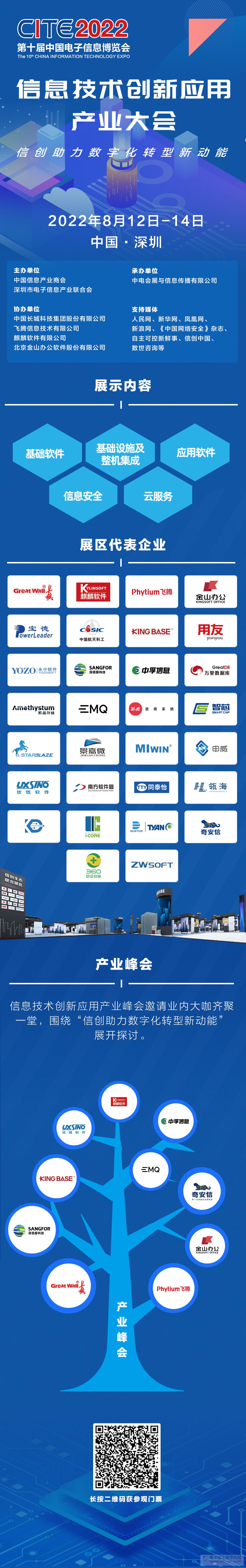 这两年,在新基建趋势推动下,中国的信创产业迎来了蓬勃发展的新时代,为国内信创产业上下游厂商带来历史性发展机遇,基础设施、基础软件、信息安全、应用软件和云服务等经历了重点信创行业试点的实践历练,未来有望在重点行业取得更高的渗透率。CITE作为信创产业展示的重要平台,将于2022年8月12-14日在深圳会展中心举办,展会不仅为企业提供精准、高效的产品推广和技术宣传,提升企业品牌知名度,还为展商提供客流、信息流、资金流、供应链支持等产业资源,大力推动了信创生态发展。长城科技、麒麟软件、飞腾信息、金山办公、宝德、航天706所、人大金仓、用友、永中软件、深信服、中孚信息、万里数据、紫晶存储、映云科技、技得科技、智芯微、忆芯、景嘉微、迈存、申威、优炫、南方软件园、同泰怡、瓴海科技、科盾量子、中微爱芯、云仲存储、奇安信、360政企、中望、禾众科技等国内信创龙头企业届时将集中亮相,向业界展示信息技术应用创新领域的最新技术成果。