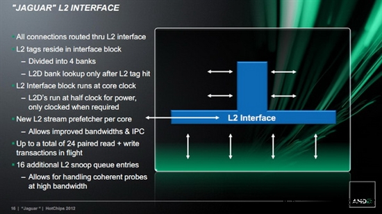 L2缓存部分AMD也做了较大调整,这也是与Bobcat架构区别较大的地方。2MB缓存被一条L2界面分成4部分512KB的区块,每部分L2D都是独占的,这一设计其实跟刚刚介绍过的Steamroller架构的动态L2缓存差不多,以1/4隔断按需分配L2缓存,不用的就可以关闭以节省能耗,主要目的就是省电,特别是对美洲豹这样面向便携平台设计的处理器来说,节能降耗对提升续航意义重大。