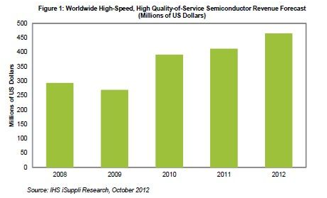 这类被称为高速、高服务质量(QoS)硅片的半导体营业收入,今年预计将达到4.652亿美元,高于去年的4.118亿美元,如图1所示。该市场2008年营业收入为2.932亿美元,2008-2012年的复合年度增长率亦为13%。IHS iSuppli公司的预测显示,营业收入在未来四年将增长到8.79亿美元左右。
