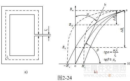 从图2-24-b以及(2-72)式可以看出,当 μcl1/lc>>1时,有气隙铁芯的平均导磁率μa 基本与气隙l1 的长度成反比;因此μcl1/lc 的值正好就是对应图2-24-b中,切线o-b与B轴夹角α 的正切值tgα ; △H代表μcl1 ,△B 代表lc。 μc与l1相乘正好把两条正交直线H和B的单位进行归一化,要么它们之间的夹角就没有意义。