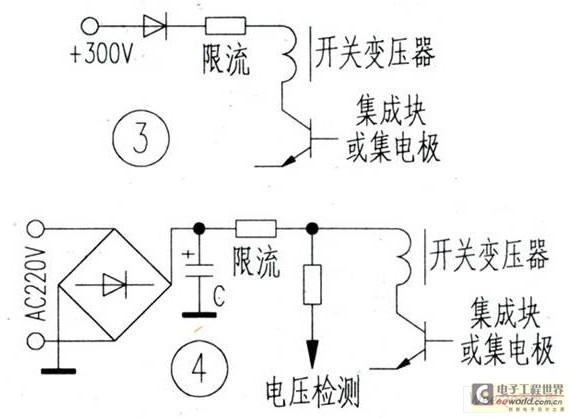 5.对于图4接法的低压电源电路.代换时.可把整流小侨堆和滤波电容取下.再按图2所示.用两只二极管接至电压检测端.断开与原开关变压器的连接(如不这样做,也会出现报警不工作)。图4线路常见于容声牌机型的低压电源部分。