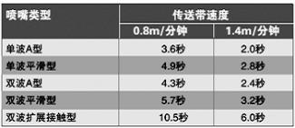 面对目前不断上升的无铅焊锡的价格,如果不是必须的话,就不要使用扰流波。图2显示了基本的波峰形式。每一种喷嘴配置在特定的导轨速度下都有不同的接触时间。通常A型喷嘴的单波峰系统接触时间最短,双波峰扩展接触系统时间最长。表1给出了各种不同的常规喷嘴配置的接触时间。