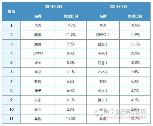 2014年6月,国产手机市场品牌关注格局较上月发生了大范围的变化,本月最受关注的十家品牌中,七家品牌的排名变化。产品关注榜也较上月出现明显变化,锤子、魅族、OPPO旗下三款产品占据前三甲。从具体参数来看,千元以下国产手机的关注度愈发集中,竞争力持续增强。