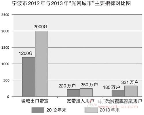 在提升信息基础设施支撑能力方面,宁波宽带接入能力不断提升。2013年光网覆盖家庭用户达331万户,家庭接入能力最低达30M,最高达100M;农村光纤网络接入水平平均达4M,基本实现行政村村村通光纤。此外,宁波“无线城市”建设特色明显。WIFI网络已基本覆盖重点公共场所,供市民免费接入和使用,全市已累计建设WLAN无线热点7400个,AP5.9万个;3G无线宽带网络已全面覆盖城区,3G用户达400万户;开通4G站点3000多个,覆盖95%的城区,用户达1.5万户。