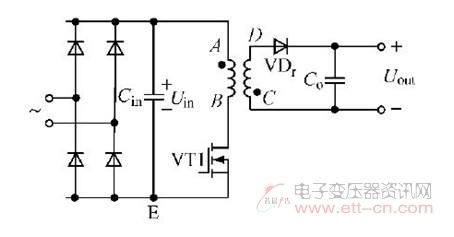 在图1 所示的反激式开关电源中,变换器工作于连续模式时,开关管VT 导通后,B 点电位低于A 点,一次绕组匝间电容便会充电,充电电流由A 流向B;VT 关断后,寄生电容反向充电,充电电流由B 流向A。这样,变压器中便产生了差模传导EMI。同时,电源元器件与大地之间的电位差也会产生高频变化。由于元器件与大地、机壳之间存在着分布电容,便产生了在输入端与大地、机壳所构成回路之间流动的共模传导EMI 电流。