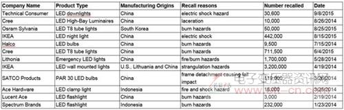 2015年,在美国和加拿大被召回的LED T8灯管数量达到761,500台,是撤回的产品中数量最大的,这实在让人感到震惊。相比较而言,2014年,LED应急灯和壁灯召回数量最大。其中,2015年8月25日,科锐召回中国制造的LED灯管占据了这一年总召回数量的近93.43%。其后,欧司朗于9月初召回了韩国制造的约5万只LED灯管。