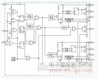 IRS2453自振全桥驱动器具有较高的工作电压(600V),内部有一个类似于555定时器的频率可设置的振荡器,全桥栅极驱动可保证其精确的死区时间。在此芯片内部,包含MOSFET组成的全桥电路。这样的构造,一方面节省了开关电源模块外部器件,降低了成本;另一方面,节省了空间,使整个电源的体积缩小。更重要的是,在芯片内部,开关管工作的占空比固定。在该全桥电路前端结构中,各开关管的占空比可接近50%,这使得全桥电路中开关管的占空比可达到95%,甚至更高。而通常情况下,MTD2002开关管的最大占空比小于80%。这样,全桥电路中开关管的占空比上升,导通损耗下降。而且,本设计属不调节脉宽形式,效率得到了很大程度的提高。IRS2453自振全桥驱动器原理框图如图2所示。