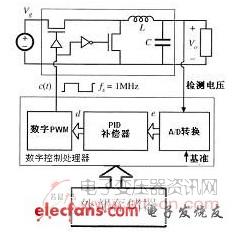 随着数字芯片和电源技术的发展,现在出现了为电源控制而开发出来的控制处理器,它不同于数字芯片的中央处理器。控制处理器主要由高速AD转换器,数字PID补偿器和数字PWM输出三部分组成。反馈环路的控制由它来完成,中央处理器作为管理模块应用在电源上。其原理图如图3所示: