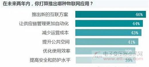其他机构正在跟随这些领先的参与者,建立自己新的互联方案。下图显示了在每个分类中,将在未来两年内启动的物联网项目的机构百分比。新的互联设备和服务处于列表的顶部,有46%的企业做了这一选择。
