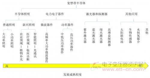 根据第三代半导体的发展情况,其主要应用为半导体照明、电力电子器件、激光器和探测器、以及其他4个领域,每个领域产业成熟度各不相同。在前沿研究领域,宽禁带半导体还处于实验室研发阶段。