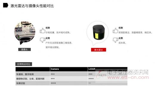 在无人驾驶环境感知设备中,激光雷达和摄像头分别有各自的优缺点。