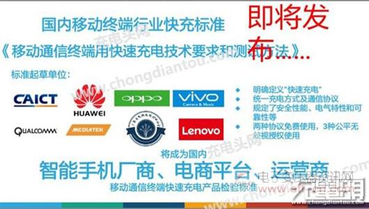 这是国内移动中对岸行业第一个快从标准,将明确定义“快速充电”,并统一充电方式、通信协议,规定安全性能、电器特性和可靠性等,并透露两种协议免费使用、三种公平无歧视授权使用。