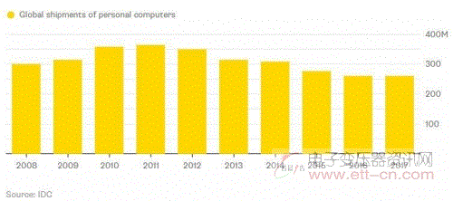 PC近十年的销量变化图。PC销量在2011年达到顶峰,此后连年下滑(注:数据不包括Surface、iPad Pro等带有可拆卸键盘的设备;2017年的数据为初步数据)