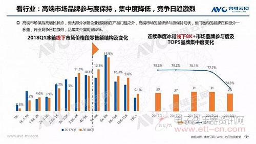 5.高端市场日渐增长,品牌参与度持稳,竞争日趋激烈。冰箱行业的进入门槛较低,但高端市场的门槛仍然存在。目前突破高端门槛的企业基本完成高端产品布局,未来高端市场的较量将在为数不多的企业中展开,品牌集中度走低,竞争日趋激烈。
