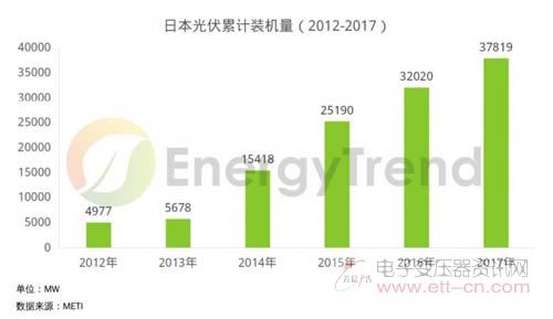 2012年至2017年,日本可再生能源发电的装机量年均增速达到26%,光伏产业为主要增量。2012年日本光伏累计装机量为4.977GW,根据集邦咨询旗下新能源研究中心集邦新能源网EnergyTrend统计,截止2017年底,日本光伏累计装机量为37.819GW,包含屋顶光伏装机量5.19GW。2017年日本光伏新增并网装机量为5.799GW,较2016年的6.83GW,下降了约15%。