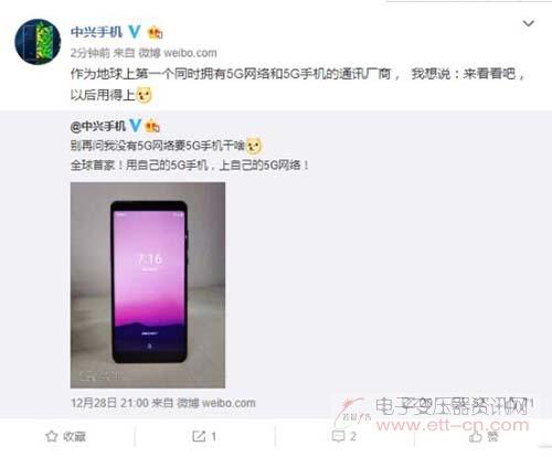2018年12月29日,中兴手机通过官方微博宣布,中兴是全球首家同时拥有5G网络和5G手机的通讯厂商。