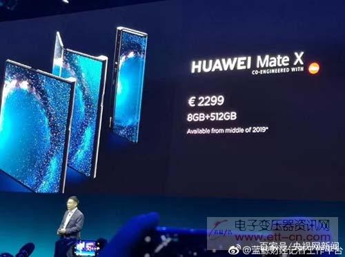 2月24日,华为在西班牙巴塞罗那举办的2019世界移动通信大会(MWC)上,正式发布其首款5G折叠屏手机——HUAWEI Mate X,售价为2299欧元(约合人民币17500元)。