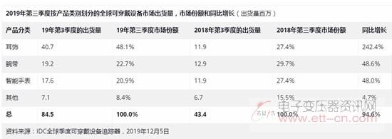 与所有其他可穿戴产品相比,耳饰设备的同比增长最高,市场份额最大。它不仅19年3季度业绩创下了四分之一的新纪录,同时也为19年4季度奠定了坚实的基础。