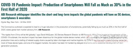 据国外媒体报道,来自市场研究公司ABI Research的研究报告预测称,“停滞的供应”加上“瘫痪的需求”,将导致全球上半年智能手机产量下降30%。报告表示,Covid-19疫情在中国的爆发,对全球移动设备市场造成了至关重要的影响,随后,由于劳动力短缺和受到影响的物流,全球移动设备市场出现了生产大规模中断和相关供应链的停滞。