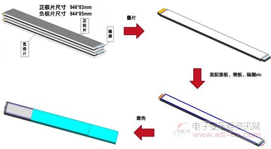 “刀片电池”这个名字的来历,便是独树一帜的电池形状。与传统的方形电池不同,刀片电池的正极片、负极片和隔膜都做成了长方形的片状结构。其中,正负极片的尺寸如图所示,长宽比超过了10:1的地步。在叠片并装配盖板、侧板、隔圈etc后套壳构成电芯。相比较整个电芯接近1米的长度和9厘米的宽度,电芯厚度仅为13.5毫米,因此所谓“刀片电池”倒也名副其实。