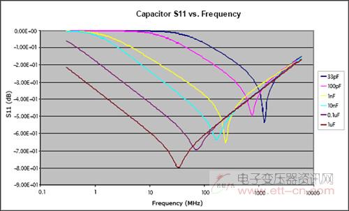 使用星形拓扑 VCC 引线时,还有必要采取适当的电源去耦,而去耦电容存在一定的寄生电感。事实上,电容等效为一个串联的 RLC 电路,如图 2 所示,电容在低频段起主导作用,但在自激振荡频率(SRF) 之后,电容的阻抗将呈现出电感性。由此可见,电容器只是在频率接近或低于其 SRF 时才具有去耦作用,在这些频点电容表现为低阻。图 3 给出了不同容值下的典型 S11 参数,从这些曲线可以清楚地看出它们的 SRF,还可以看出电容越大,在较低频率处所提供的去耦性能越好(所呈现的阻抗越低)。