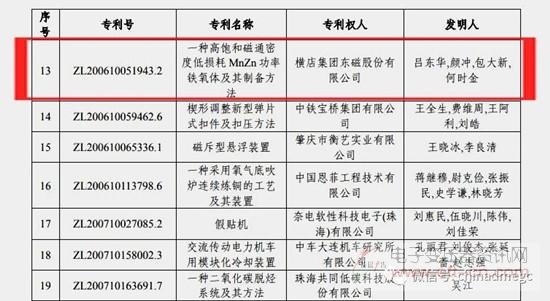 近日,国家知识产权局发布公告,对第二十二届中国专利奖评审结果进行了公示。横店集团东磁股份有限公司申报的发明专利《CN200610051943.2一种高饱和磁通密度低损耗MnZn 功率铁氧体及其制备方法》获得中国专利优秀奖。