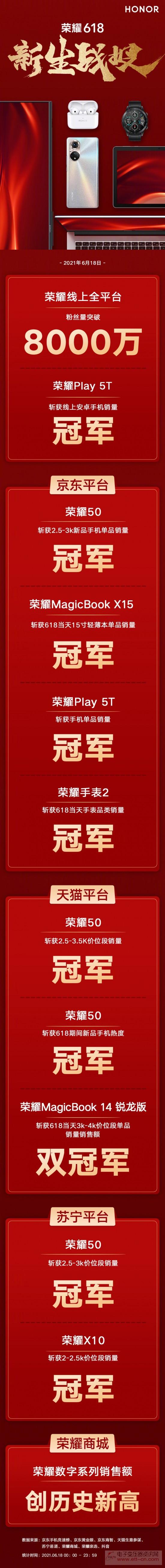 据荣耀官方战报显示,6月18日当天,荣耀携新品荣耀50手机夺得全平台多项冠军;智慧全场景产品荣耀MagicBook系列、荣耀手表2斩获多品类冠军;荣耀线上全平台粉丝量突破8000万。在京东平台,荣耀手表2斩获618当天手表品类销量冠军;在天猫平台,荣耀MagicBook 14锐龙版斩获618当天3000-4000元价位段单品销量、销售额双冠军。