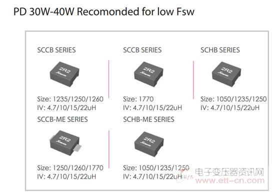 如下,列举PD电感中较为主推的产品系列,针对目前较为通用的PD几档功率来进行分类,可供参考: