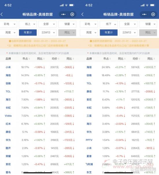 据奥维云网(AVC)监测数据,2022年1-13周(1月1日到3月27日)国内彩电线上销量,小米排在第一,市场占有率为18.17%,同比下降1.99%;海信排在第二,市场占有率为14.13%,同比上涨0.95%;创维排在第三,市场占有率为10.5%,同比下降0.17%;第四名则被TCL拿下,市场占有率为9.67%,同比下降1.84%。