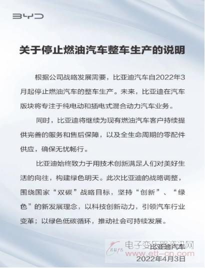 4月3日,比亚迪发布公告称,根据公司战略发展需要,比亚迪汽车自2022年3月起停止燃油汽车的整车生产。并表示,未来,比亚迪在汽车版块将专注于纯电动和插电式混合动力汽车业务。