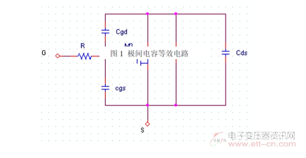 功率MOSFET 是电压型驱动器件,没有少数载流子的存贮效应,输入阻抗高,因而开关速度可以很高,驱动功率小,电路简单。但功率MOSFET 的极间电容较大,其等效电路如图1 所示,输入电容Ciss,输出电容Coss 和反馈电容Crss与极间电容的关系可表示为: