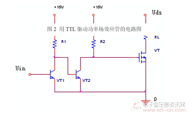 比较简单又比较可靠的驱动方式是使用集电极开路的 TTL 按图2 所示与功率MOSFET连接。这种方式可以产生足够高的栅压使器件充分导通,并保证较高的关断速度。由于外接负载电阻RL 须有一定大小,以限制TTL的低电平输出晶体管的功率耗散,因而这种驱动方式的开通速度不够高。