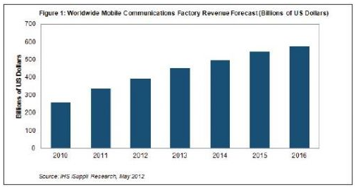 上述预测数据由无线通信产业各领域中的OEM厂商的总体工厂营业收入构成,包括手机、媒体平板和移动基础设备等主要领域,以及无线路由器、无绳电话、电池充电器和灰市手机等辅助领域。