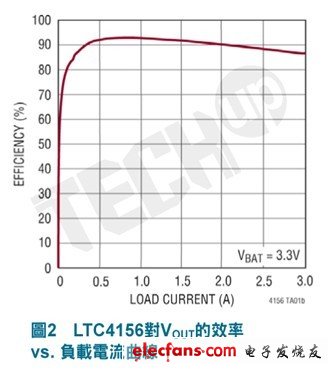 LTC4156的交换式电压调整器扮演变压器的功能,让VOUT上的负载电流超过输入端电源汲取的电流,而且相较于典型的线性模式充电器,大幅增加电池充电器可利用的电力。先前的例子显示LTC4156最高能使用3.5安培的电流进行快速充电,带来更快的充电时间。不同于一般的交换式电池充电器,LTC4156具有瞬间启动的运作模式,即使电池损坏或经过深层放电,也能确保系统电力的可用性。如图2所示。