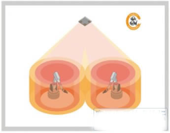 对于汽车制造领域中的机器人控制,采用SafetyEYE即可达到类似下图中的效果。一套系统既可以实现原先需要三套甚至更多系统才能够完成的安全功能!