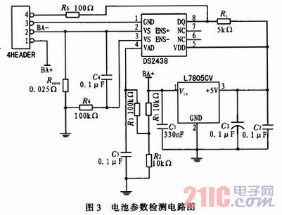 电池温度测量通过内部的温度传感器将测量结果存放在DS2438温度寄存器(第0页1、2字节)中,通过单总线输入输出端口(DQ)与单片机P2.0端口完成串行数据传送。电池参数采集电路如图3所示。