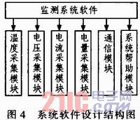 在设计过程中采用模块化编程,方便更新、维护与拓展,整个系统由温度数据采集模块、电压数据采集模块、电流数据采集模块、电量数据采集模块、通信模块和系统帮助模块等组成。监测系统利用Labview程序发送16进制数据给单片机,启动各采集模块采集数据,实时记录参数,利用上位机进行数据处理和显示。既实现了采集监控的功能,又可以进行数据的进一步处理和分析。系统软件设计的结构图如图4所示。