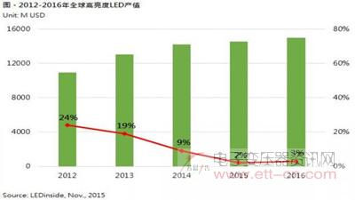 预估今年全球高亮度LED市场产值达145.2亿美元,年增长仅2%;2016年也仅有149.5亿美元,年增长3%。尽管LED使用数量在照明需求带动下持续成长,但效率提升使LED使用颗数减少、加上跌价压力仍在,因此展望未来五年,LED产业的年复合增长率将不容易出现如过去10%以上的增长幅度,产业成长将趋缓。