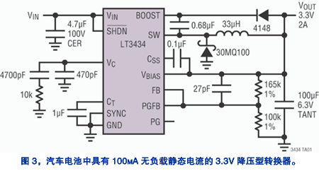 凌特公司最近推出的DC/DC转换器LT3434解决了上述汽车导航应用的很多关键问题,它属于一个不断扩大的 60V单片降压型开关稳压器系列。LT3434工作在3.3V~60V的宽输入电压范围,参见图 3。它在负载电流高达2.5A 时仍具有高效率。在所有电压、负载和温度条件下,其基准准确度均为±2%。
